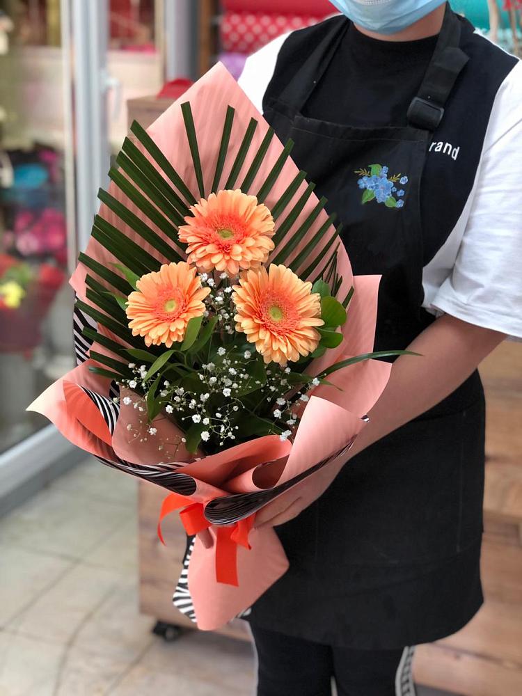 Подарите кусочек солнца, чтобы наполнить обычный день дорогого Вам человека светом и теплом. С этой задачей обязательно справится букет «Солнышко в руках». Его позитивные оранжевые герберы, зелень чико, рускус и гипсофила, обрамленные в подходящую упаковку из оранжевой пленки и зеленой сетки, идеально подойдут Вам.